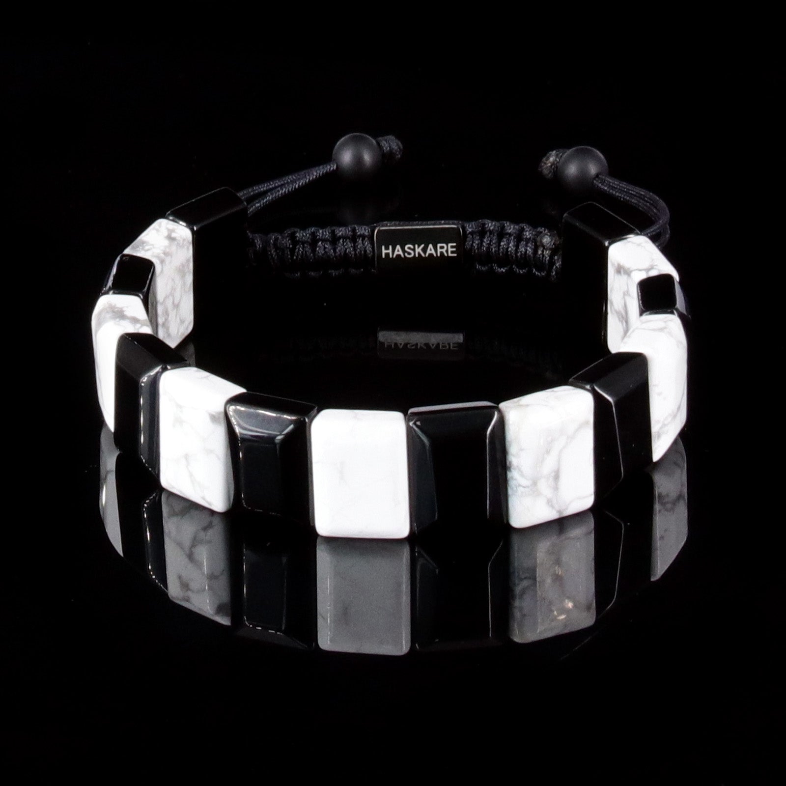 This unique bracelet features larger, smooth rectangular beads—alternating genuine White Howlite and Black Obsidian—creating a dialogue between soft, muted texture and deep, sleek contrast. Strung on ultra-durable nylon threading with a classic adjustable pull-tab closure, it blends understated refinement with practicality, lightweight enough for worry-free daily wear.