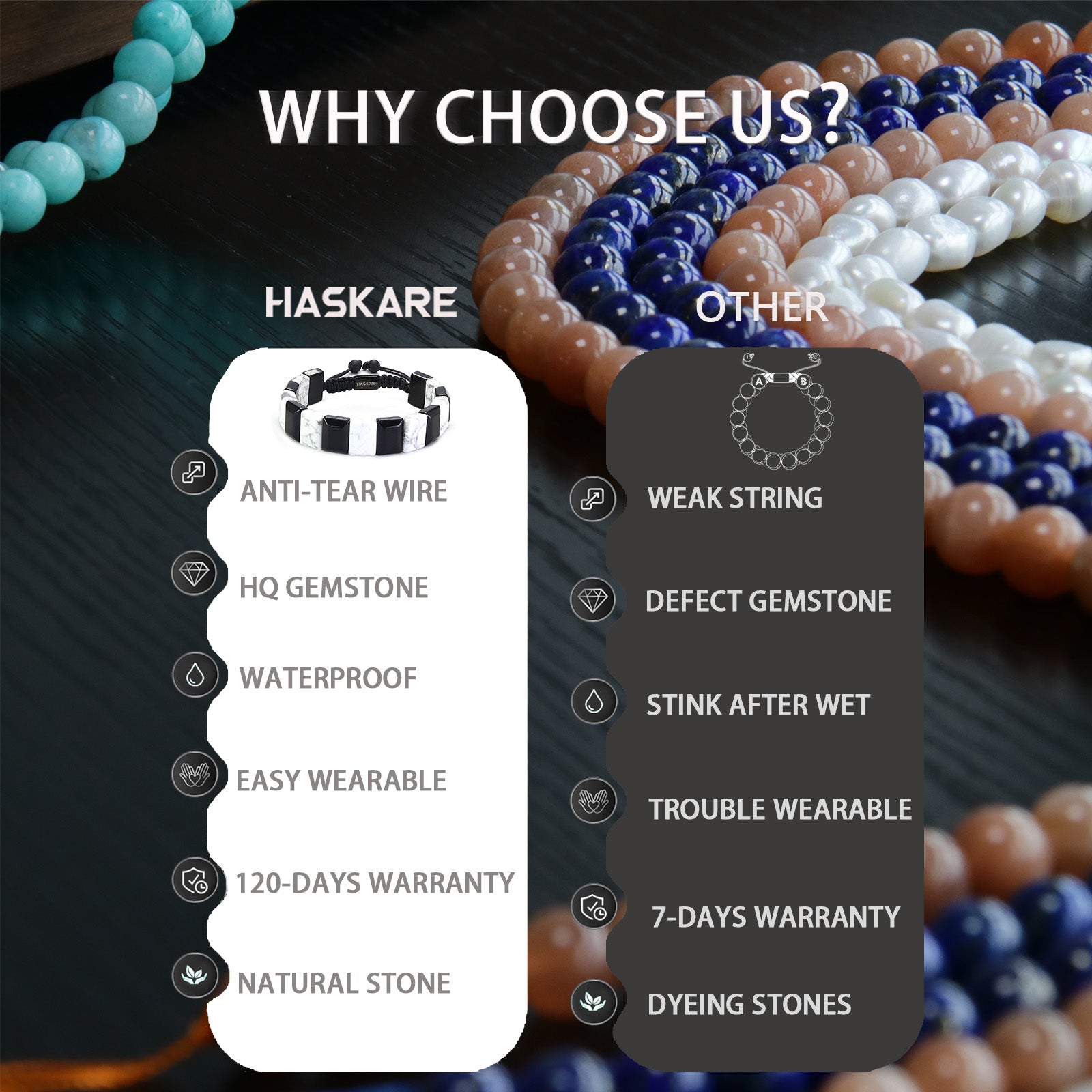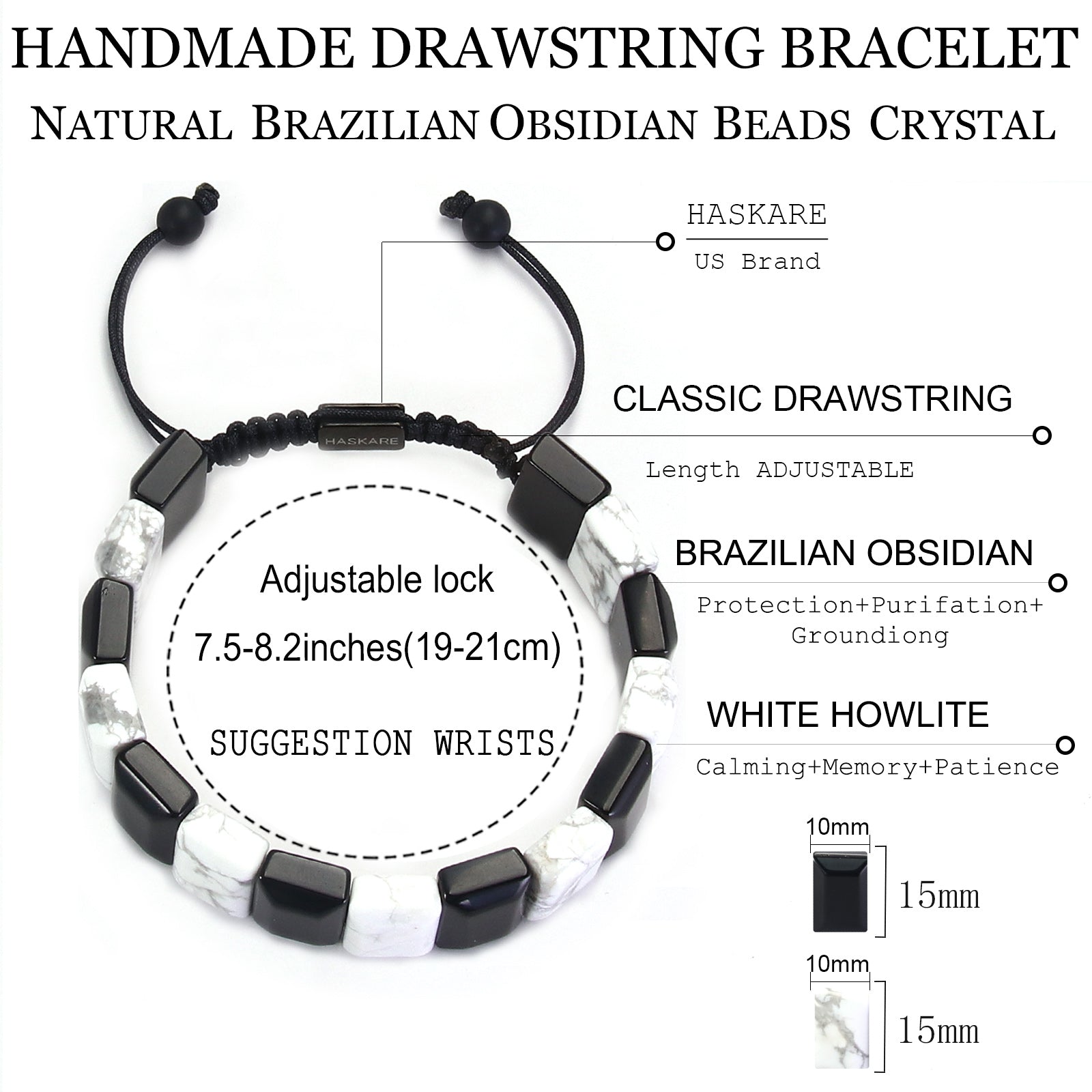 Handcrafted with meticulous care, each bead highlights natural charm: White Howlite showcases subtle, earthy patterns, while Black Obsidian boasts a smooth, polished finish. The reinforced nylon threading outperforms ordinary cords, eliminating the hassle of frequent restringing and ensuring the bracelet retains its shape and durability through daily use.