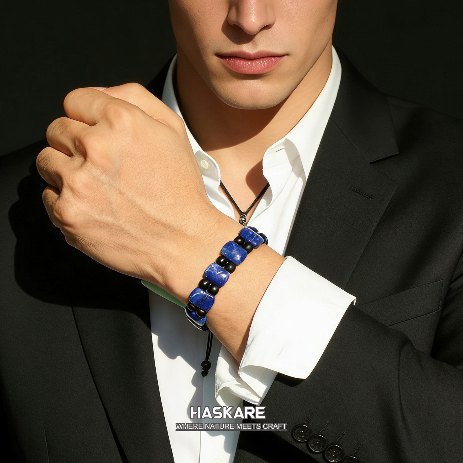 Redefines understated elegance through modern craftsmanship and curated natural materials. It balances rich deep-blue lapis lazuli oval stones (shield-inspired) with sleek 6.5mm black onyx, creating a cohesive, refined look. Embodying both style and durability, it marries intentional design with everyday wearability.