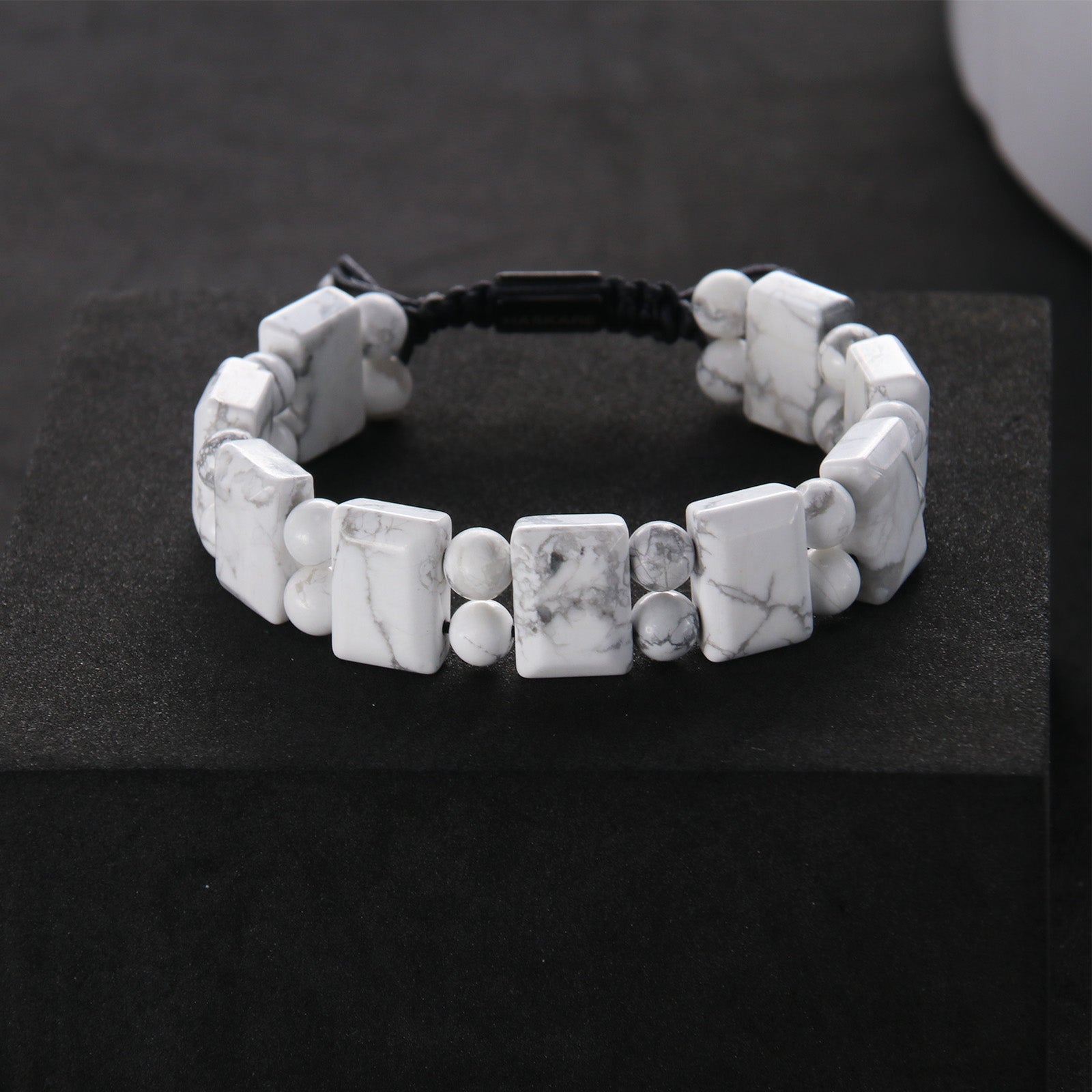 - Designed for mindful elegance, this unique mens bracelet features smooth rectangular white howlite stones—celebrated for their soothing properties—strung on durable nylon cord. The adjustable drawstring closure ensures a secure, comfortable fit, maintaining shape while adding peaceful sophistication to meditation sessions or everyday looks.