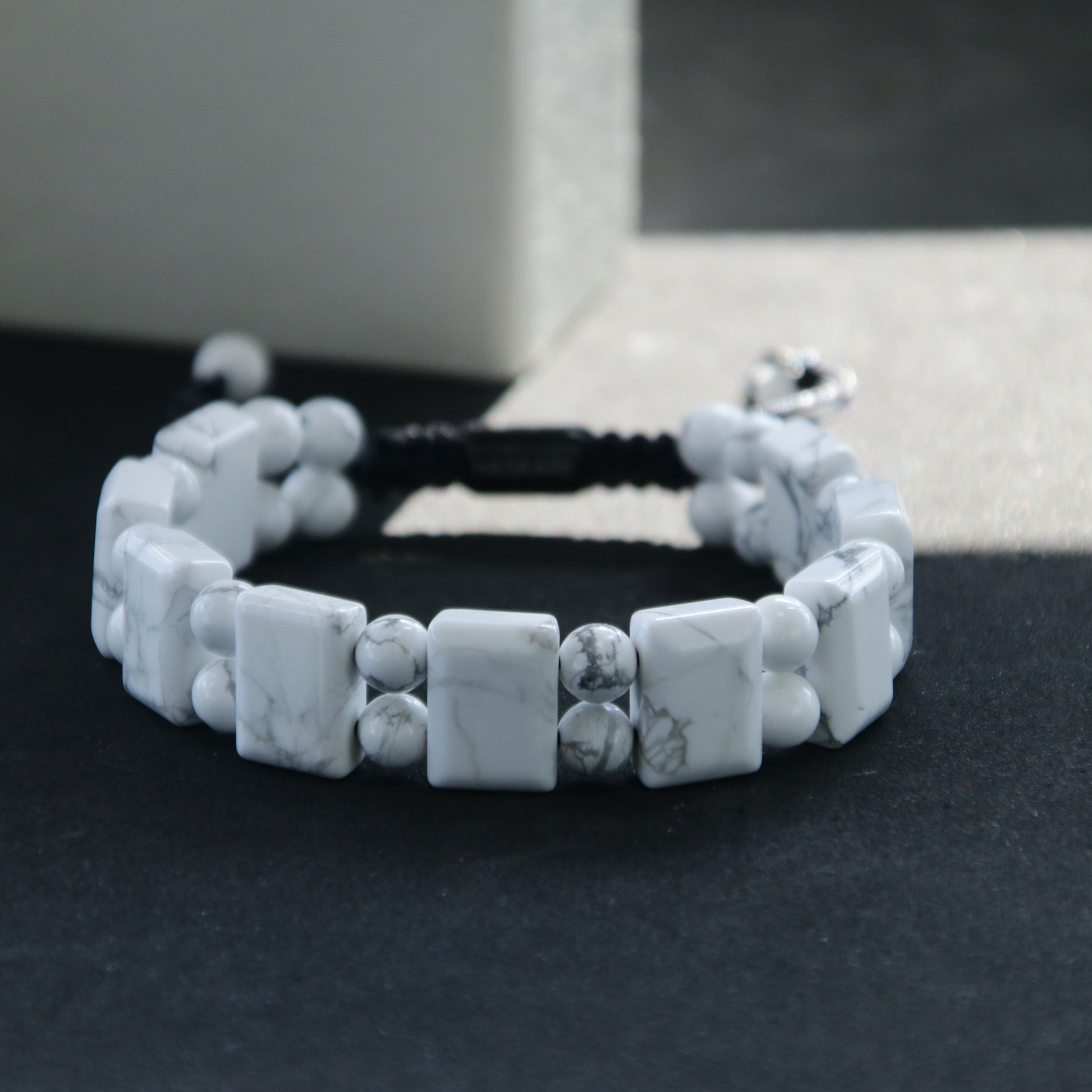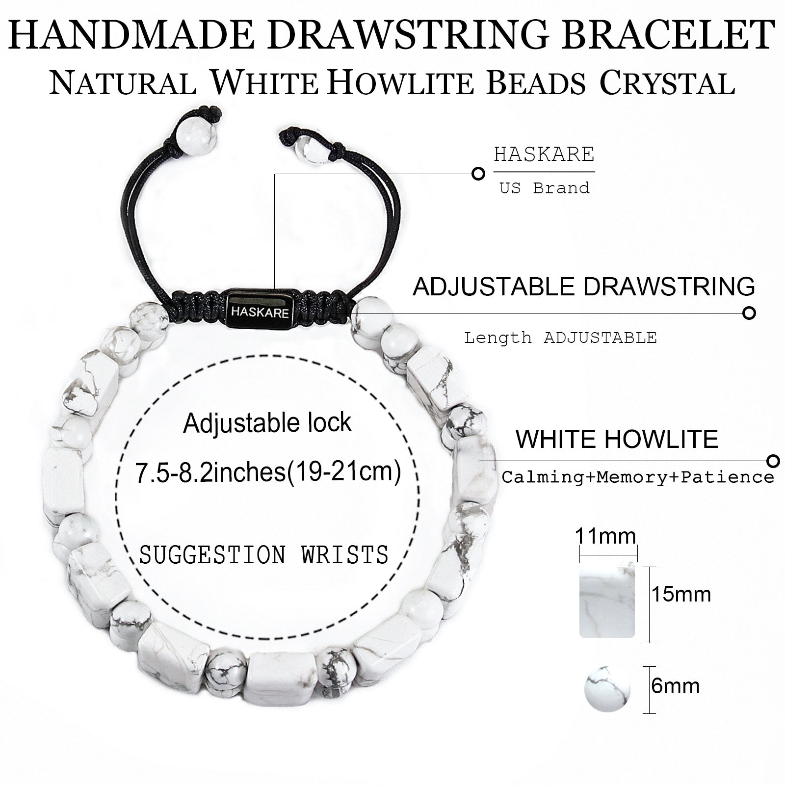 Designed for mindful elegance, this unique men’s bracelet features smooth rectangular white howlite stones—celebrated for their soothing properties—strung on durable nylon cord. The adjustable drawstring closure ensures a secure, comfortable fit, maintaining shape while adding peaceful sophistication to meditation sessions or everyday looks.Genuine white howlite, revered in crystal healing for promoting tranquility and positive energy, blends elegance with spiritual symbolism. The adjustable drawstring fits 19-21cm (7.5-8.2") wrists, making it a meaningful accessory for natural stone jewelry lovers or a heartfelt gift.Crafted with carefully selected high-quality white howlite beads: each smoothly polished gemstone showcases unique texture patterns, enhancing the minimalist design with distinctive charm. It caters to men who appreciate authentic natural gemstone jewelry with purpose and understated style.Presented in a branded gift box with a matching gift bag and cleaning cloth, it’s ideal for holidays, birthdays, or anniversaries. Conveying “he deserves to be cherished,” it’s a sincere token for boyfriends, husbands, fathers, or brothers—blending ceremony and practicality.This bracelet embodies HASKARE’s core philosophy: merging genuine natural gemstones, mindful design, and everyday practicality. We strive for your complete satisfaction—feel free to reach out if you need assistance, and we’ll go all out to help.