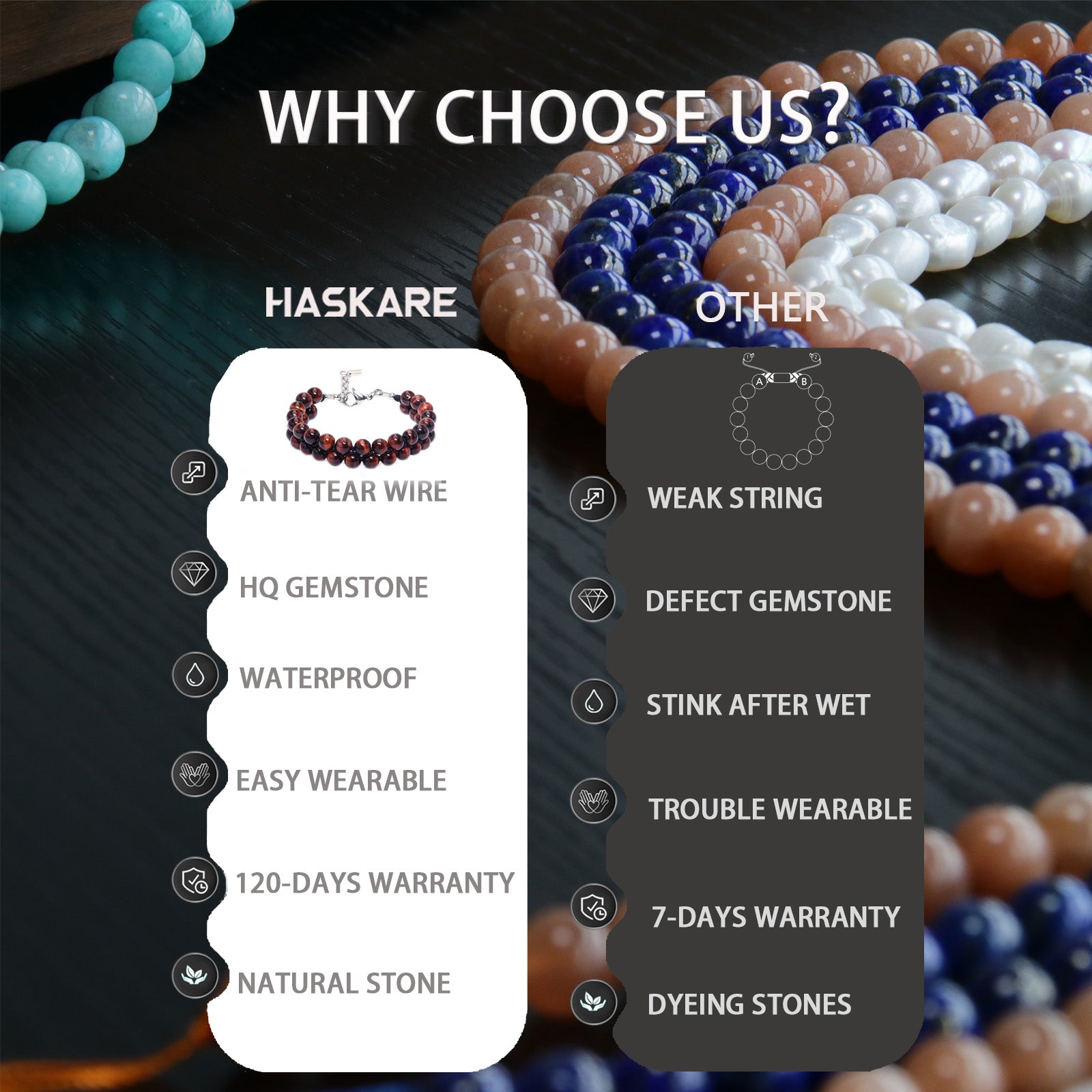Tired of bracelets snapping mid-workout? This tough men’s piece features a reinforced 316L stainless steel core—handles pulls, intense gym sessions, and drops without breaking. No more chasing beads across the floor—just solid, dependable style that stays put, letting you focus on your goals with unshaken confidence.Crafted with premium South African red tiger eye, each bead is hand-polished for a smooth, luxurious feel (no rough edges). The heavy-duty stainless steel cable is waterproof, sweat-proof, and built to last, with an adjustable extension chain fitting 19-21cm (7.5-8.2") wrists—seamlessly fitting travel, work, or weekend adventures.Red tiger eye, revered across cultures as a stone of vitality and confidence, enhances courage, motivation, and positive energy. Its clean, minimalist design transitions effortlessly from commutes to the office to weekend trips, keeping you grounded and focused through daily challenges.Presented in a branded gift box with a matching gift bag and cleaning cloth, it’s ideal for holidays, birthdays, or anniversaries. Conveying “he deserves to be cherished,” it’s a sincere token for boyfriends, husbands, fathers, or brothers—blending ceremony and practicality.This bracelet embodies HASKARE’s core philosophy: merging genuine natural gemstones, durable craftsmanship, and active-life practicality. We strive for your complete satisfaction—feel free to reach out if you need assistance, and we’ll go all out to help.